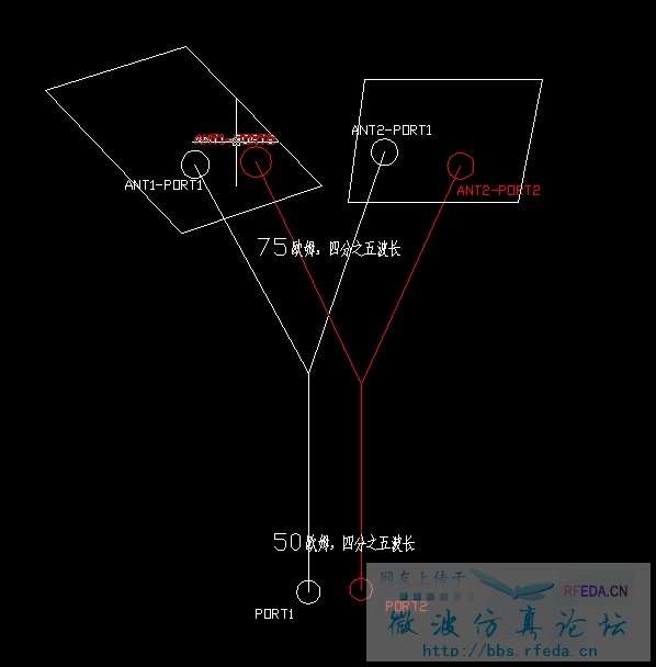 相位线功分器两个输入口使用四分之五波长,75欧姆电缆建模。输出口采用四分之一波长线,50欧姆电缆建模。