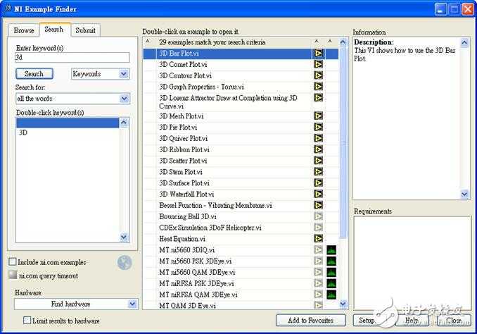 而每个 3D Graph 元件使用起来多少都会有些差异,建议除了参考元件的说明文件外,也可以参考相关的范例程序,比较能够加快元件的了解。如下图所示,只要用 3D 这个关键字去 Example Finder 内搜寻,就可以看到几乎每个 3D Graph 元件都有范例可以参考: