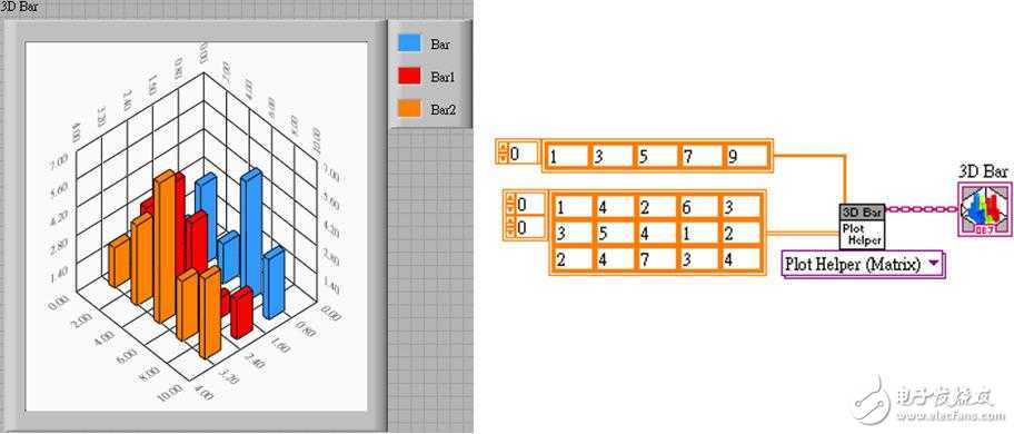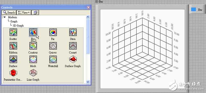 我们以 3D Bar Graph 为例来介绍。首先,在 Front Panel 上建立一个 Bar 显示元件: