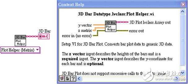接着你会在 Block Diagram 上看到 LabVIEW 会自动建立好一个元件控制 VI,由说明可得知需要两个参数输入,一个是 y vector,让你指定 Bar 的排列位置,另一个 z matrix 则是二维的资料型态,可以让你输入 Bar 的高度: