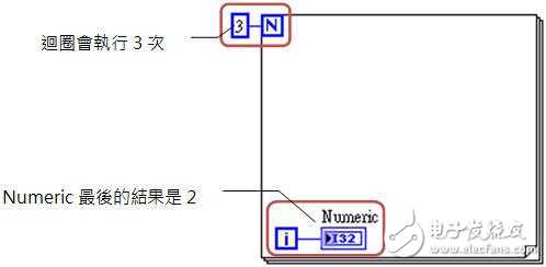 For Loop 的使用方式和 While Loop 大致上相同,在 Block Diagram 中将欲重覆执行的程序段用循环包覆起来即可。以下图为例,因为 Count (N) Node 输入的值是 3,代表循环会执行 3 次,所以 Numeric 最后的结果就是 2 (i 从 0 开始)。