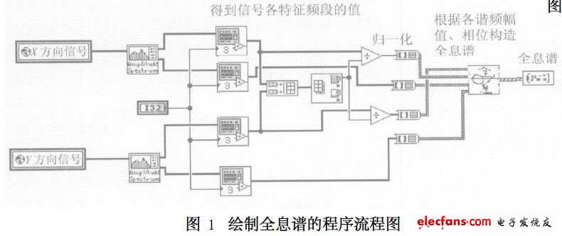 数组,然后把此两数组组合成一簇; 同样,把1 ×,2 ×, 3 ×, 4 ×(即1倍频、2倍频、3倍频、4倍频)部分的振动集成处理为包含X, Y 方向数组的簇,最后,这5个簇合成为一数组,输入到xy graph . vi显示即可。其程序的主要流程图如图1所示。