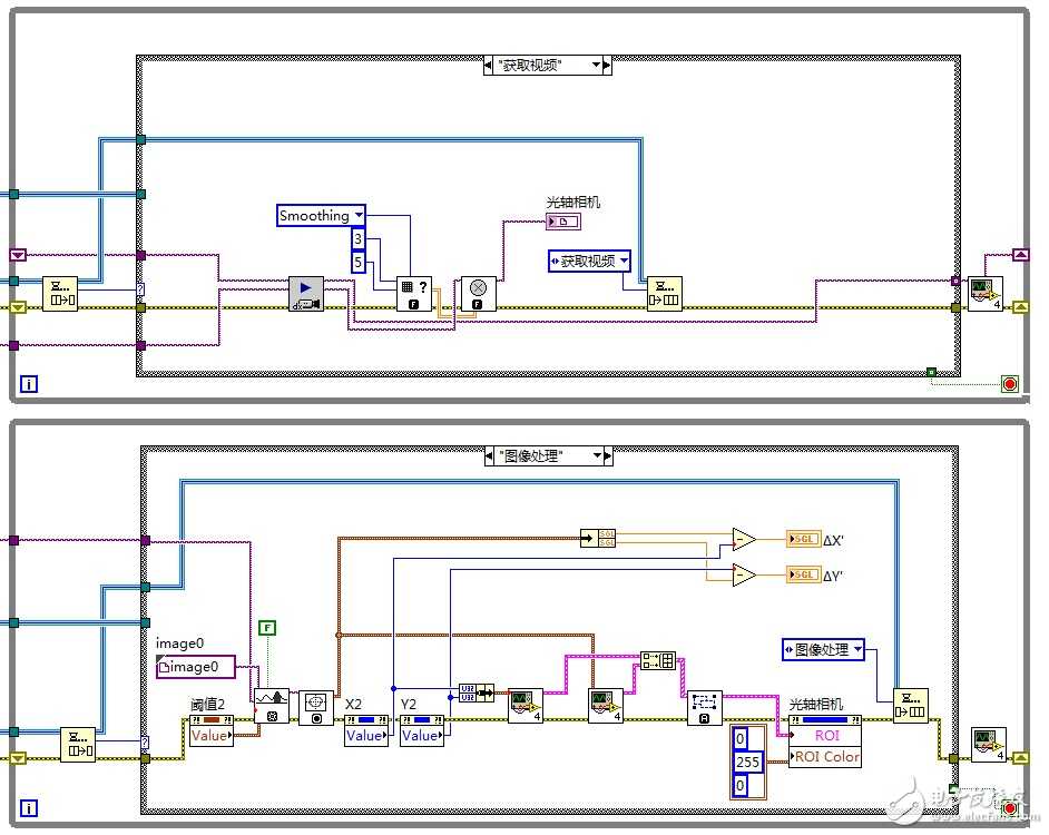 现在有一程序,一个循环用于采集图像,一个循环处理图像,但是不知道他们之间是如何传递图像数据的。请大神们帮忙解惑。多谢多谢!图形中光轴相机与image0之间是如何连接的?