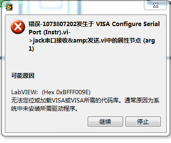 LabVIEW: (Hex 0xBFFF009E) 无法定位或加载VISA或VISA所需的代码库。通常原因为系统中未安装所需驱动程序。