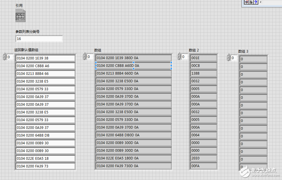 我在做下位机与上位机通讯时,返回的是十六进制数组,想将返回数组提取有用数据后(数组2)转换为十进制数输出(数组3),再写入表格控件里。为什么在FOR循环里转换不了,数组3输出都是0。请教有经验高手解答,谢谢!如下图所示。