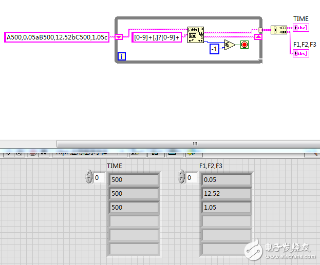Arduino通过串口发送数据到LabVIEW上,数据类似是"A500,0.05aB500,12.52bC500,1.05c"这样,想提取中间的数据,逗号前面是时间,后面是压力数值,做成电子表格,效果如: