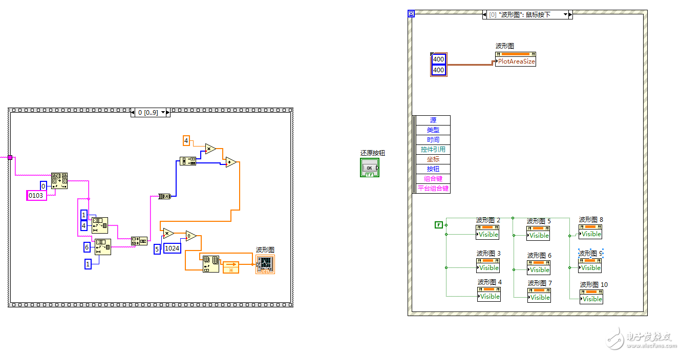 一个while循环里,前面收到数据,进行处理,后面的事件添加了一个点击波形图放大的功能,可是添加完这个功能后,就不出图了,把后面的事件删除,又开始读取数据出曲线,问题出在哪里呢?如何修改一下,请指教。