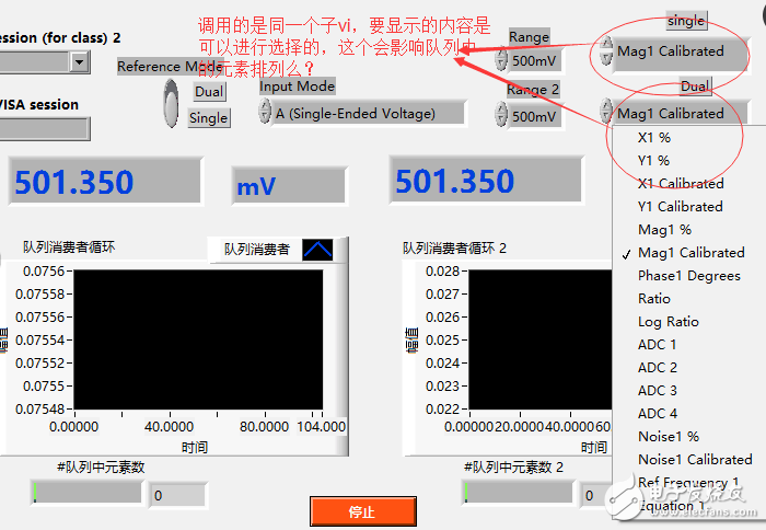 两个子VI去掉一个,数据变多的问题,貌似是因为两个子VI是顺序执行过程,子VI一直采数。两个子VI时,一次进行了两次采数,而一个子VI时,一次循环只进行了一次采数,循环变快,所以入队列数据增多。弄不清楚。