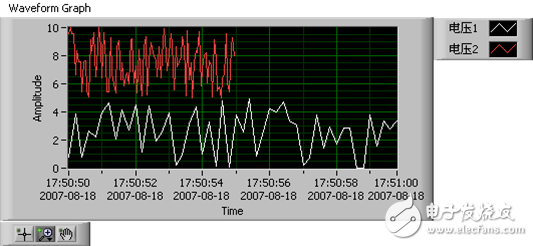 利用随机数发生器仿真一个0到5V的采样信号,每200ms采一个点,共采集50个点;再仿真另一路电压信号的范围为5到10V,采样间隔是50ms,共采100个点。要求时间轴能真实的反映采样时间。采样完成后,将两路采样信号显示在同一个Waveform Graph中