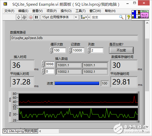 从网上下载了一个Sqlite数据库LabVIEW API工具包,运行测试速度极快。插入10000条记录平均用时37毫秒.