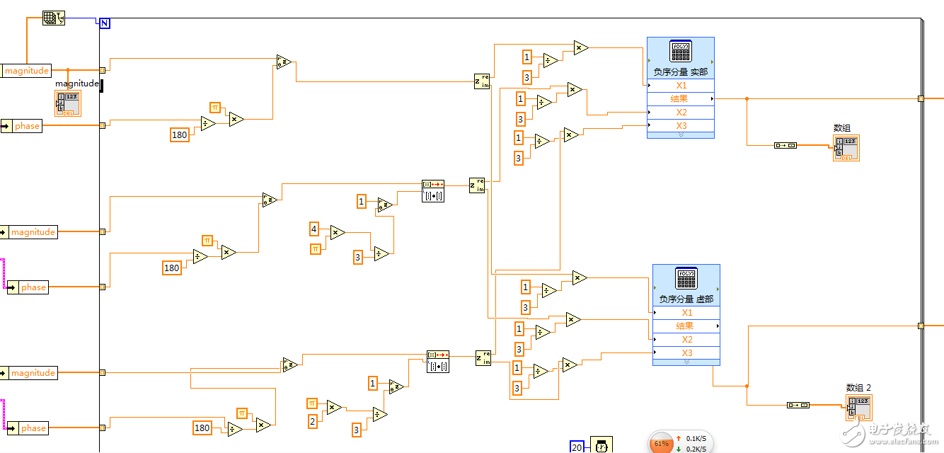 最近在用Labview做三相电流不平衡度以及谐波的相关问题,其中用到了FFT模块,用以输出各次谐波的幅值和相位,然后用For循环编写各次谐波正负零序分量的计算,我用负序分量来说明问题,程序如下1.读取三相电流数据,经FFT计算模块获得各次谐波的幅值和相位,幅值和相位数据类型都是一位数组。