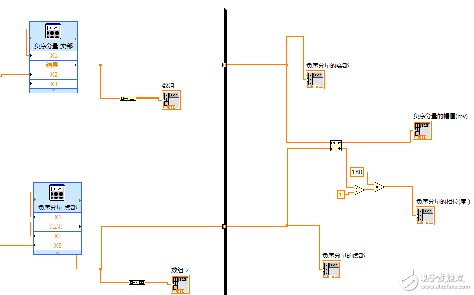 2.三相电流幅值和相位数组经For循环中负序分量计算程序输出负序分量的实部和虚部