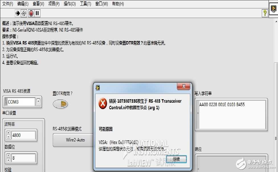 错误-1073807330发生于RS-485 Transceiver Control.vi中的属性节点(arg 1)