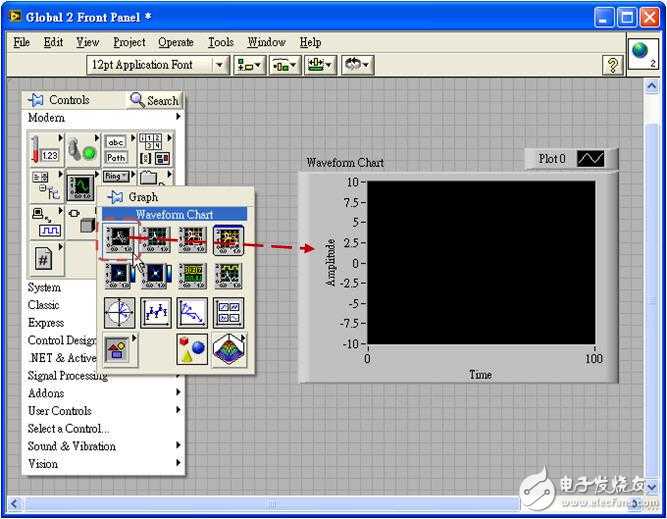 接着请在建立的全域变量上鼠标左键双击,程序会开启另一个画面,那就是全域变量的编辑画面,在该画面下,是没有Block Diagram的,你只能够建立Front Panel上的元件,之后我们就是用这些所建立的元件来在VI之间来传递资料,所以我们现在要建立的是一个Waveform Chart元件。