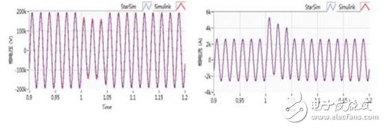 StarSim 设计了如图4 中的单端三相分布式参数线路的模块,除了电气端子外,还有数据输入和数据输出的端子,用来和对端进行电压值和电流值的交互,两个单端元件匹配起来就可以替换原来的一个三相输电线模型。分布式参数线路模型不仅可以利于并行运算,把系统切割为两个拓扑后,相当于式(1)的方程通过行列变换化为如式(4)的对角阵,一个大的方程变为两个阶次低的小方程,将大大的减少仿真的计算量。