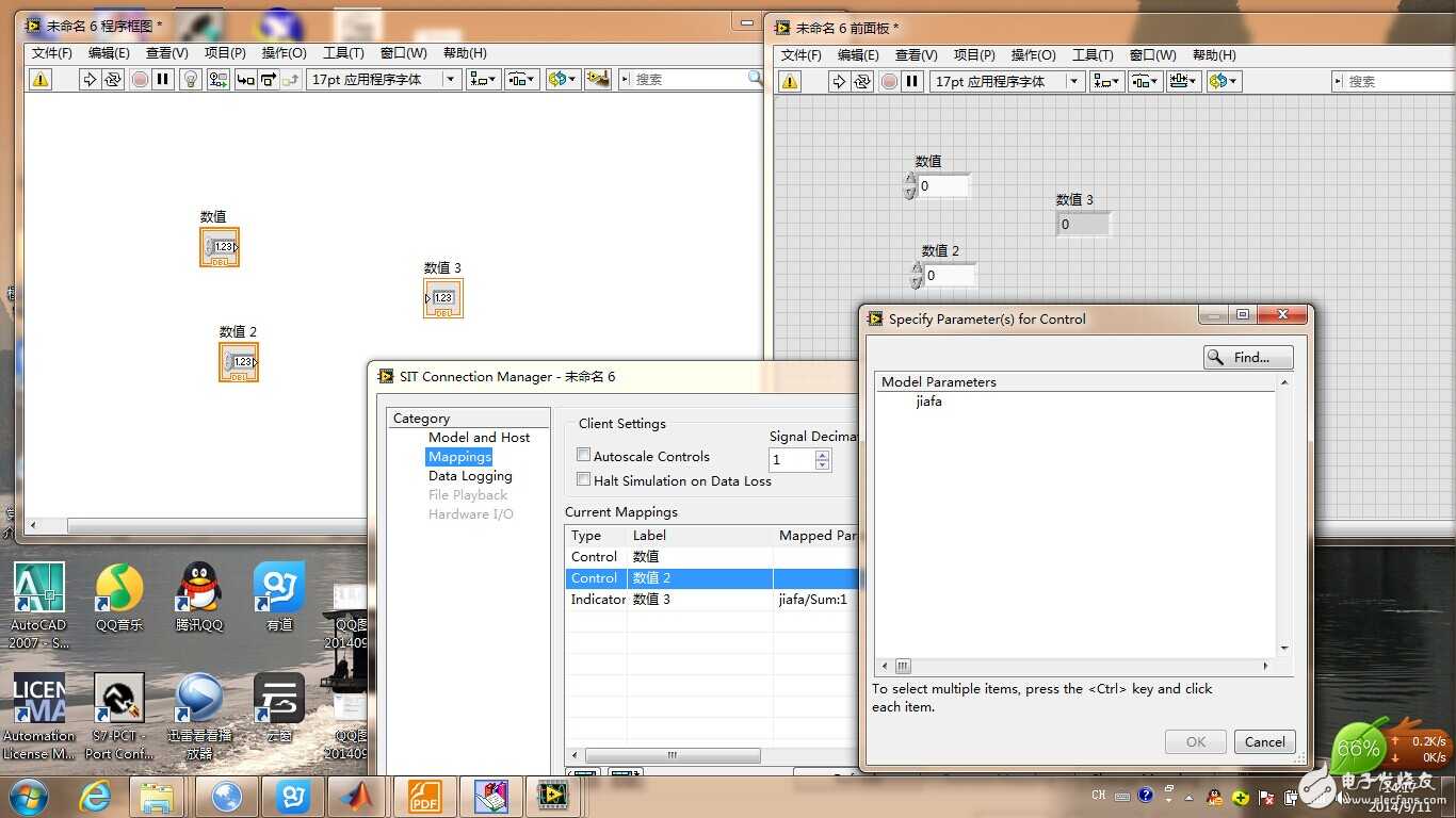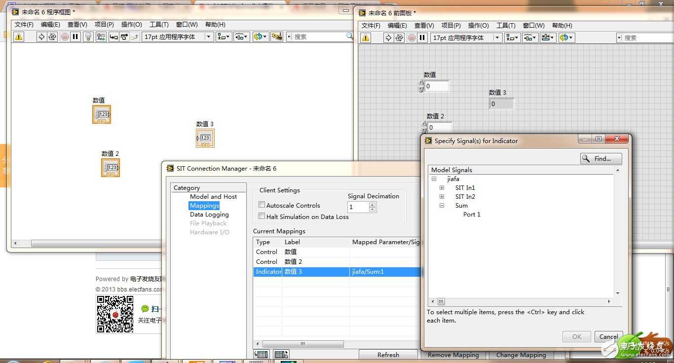 当然我是用了SIT工具包进行两者的通讯,并且通讯成功。但是 我在simulink中搭建的加法模型如图1所示。并且选择了生成nidll.tlc形式的文件 得到了MDL文件,在LabVIEW中建立了加法的模块,并使用SIT工具包 将MDL文件导入,但是到了mapping,也就是参数匹配这一步 该怎么继续下去啊 ,是不是我做的有问题呢?