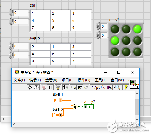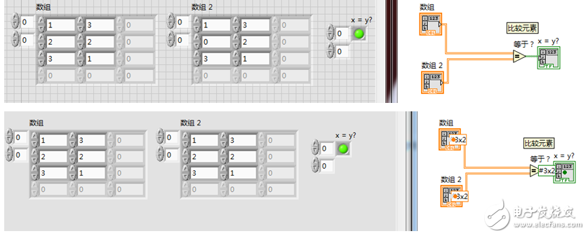 比较选板-比较两个数组是否一样,但是比较元素模式下,不管我设置两个数组中元素是否一样,布尔值指示灯都一直亮,而且返回的2维布尔值组成的数组中的数字没有任何变化,不因数组元素是够相同而发生改变。这是为什么?