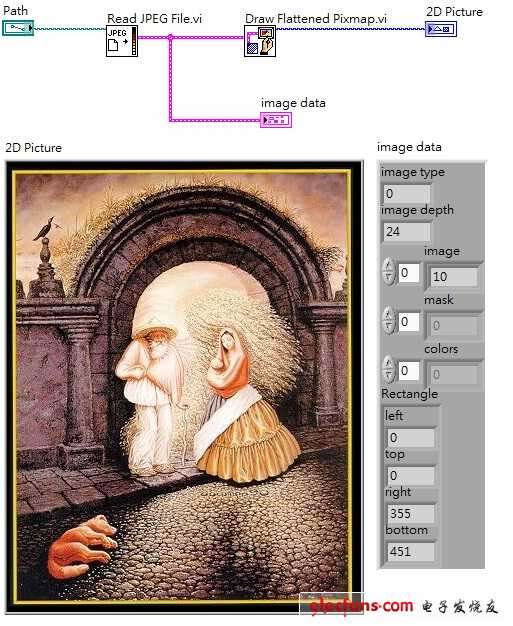 有了以上的基本功能介绍后,我们可以写一个程序将我们计算机中的 JPG 图片利用 LabVIEW 的 Picture Control 来将图片加载 LabVIEW 的程序之中。下方就是一个基本的范例,先使用 Read JPEG File 将图档读取到 LabVIEW 中,以 image data 的数据格式存在,再使用 Draw Flattened Pixmap 将 image data 转成 Picture 输出到人机接口的 2DPicture。