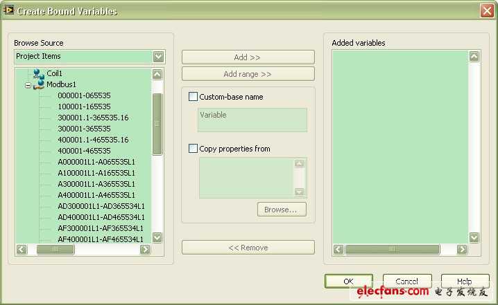 最近学习了下LabVIEW的用法,用的版本是LabVIEW 2012.Of3,也是这几天连了下PLC,在链接PLC的时候要Create Bond Variable...找到建立的I/O Server之后就可以选不同地方的地址的Coil或者Register了,如图: