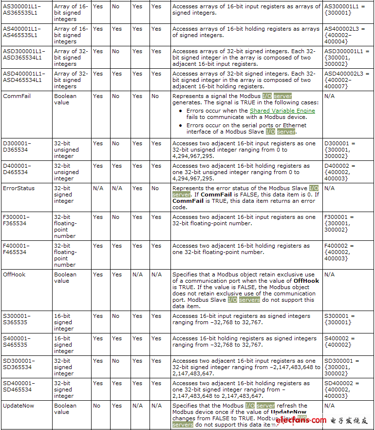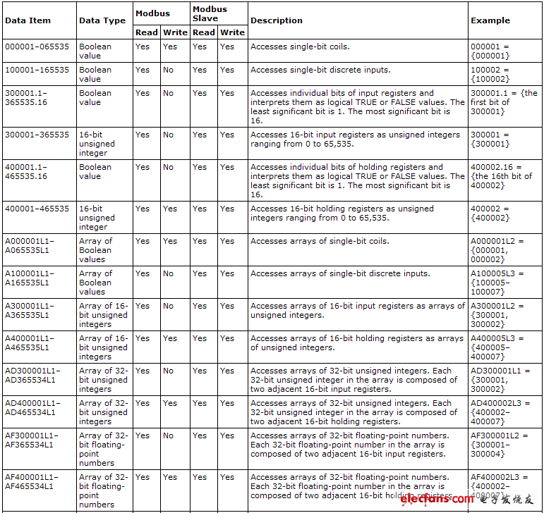 尝试了比较多次才明白原来后面的五位从00001到65534才是真正的寄存器地址,之前的只是表示它存储的数据的格式(如:Boolean或者holding register),再之前的字母就可以参考前面贴的图。例如F401102就是在PLC中地址为1100的格式为floating point的holding register在LabVIEW中的地址(注意:在LabVIEW中之前有个offset,大小和存储的数据大小一致,如在PLC中是100开始的boolean,在LabVIEW中就是101开始;而在PLC中100开始的Floating point(32-bit),在LabVIEW中就是102开始)。