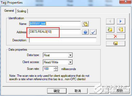 然后在OPC_server中设定一个变量,链接到该数组,具体名称为DB73,REAL0[10],长度为10,地址从0开始。如图