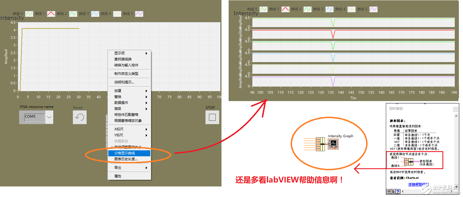 如图,在波形图表里面显示6条曲线,主要的实现方法就是在程序框图里面将多个需要显示的数据捆绑起来形成簇,然后将簇连接到波形图表,可以在前面板右键属性,选择图形分格显示或者叠层显示就可以达到这样的效果