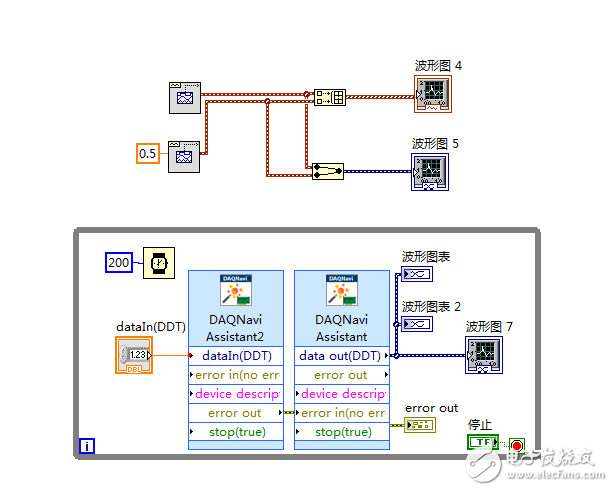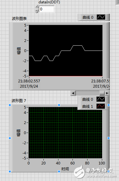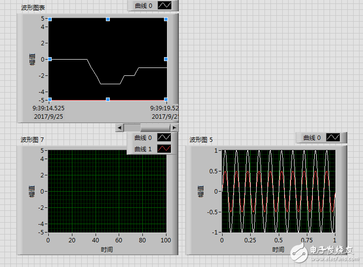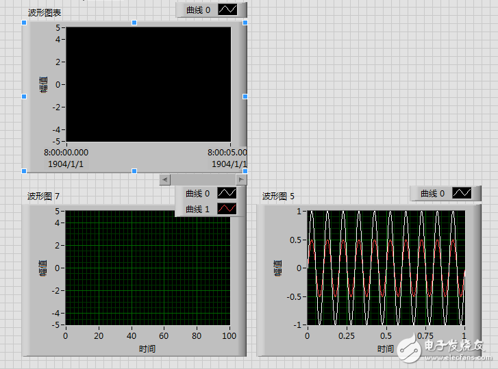 你好,你看一下程序图,它输出的是多个波形,波形图5和波形图7的输入类型是一样的,但是波形图5就是有波形的。