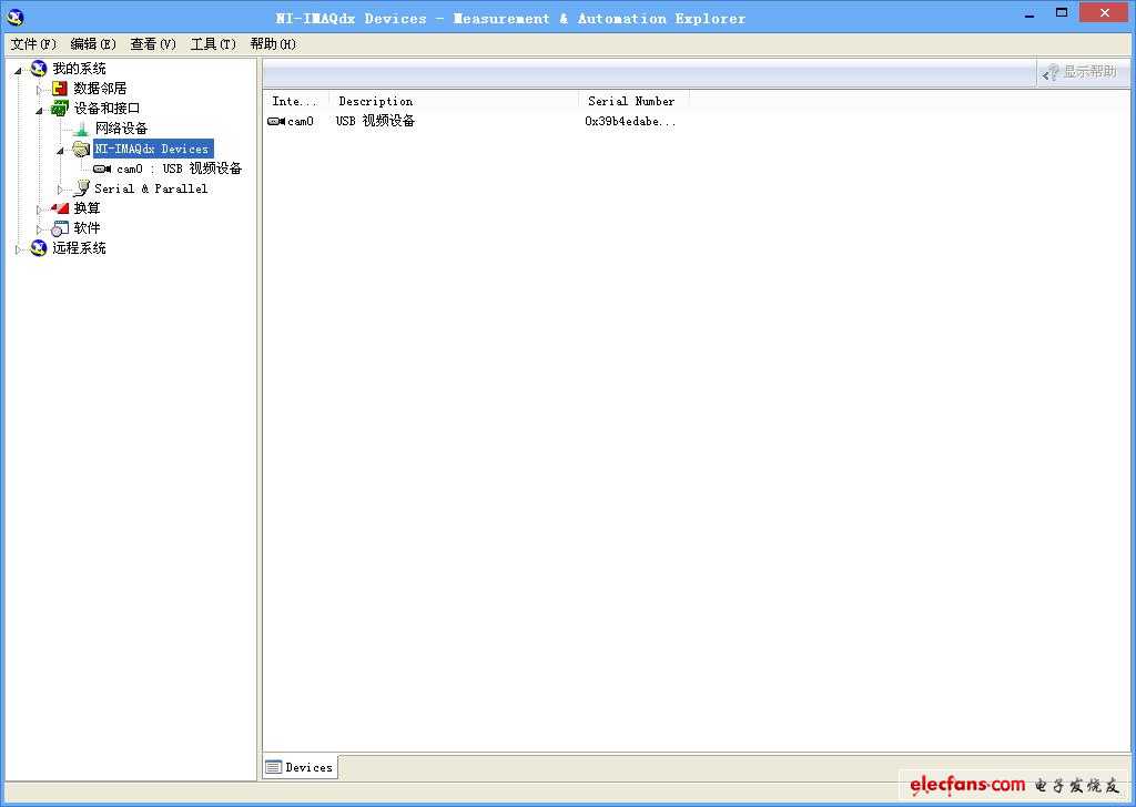第三步点击设备和接口选项:一般看你的摄像头,有几个摄像头,就会分配几个名称,cam0,cam1等(如果你用的是NI支持的工业高级摄像头,不管是USB的,还是以太网的,也是在这个地方查看)。效果如图2