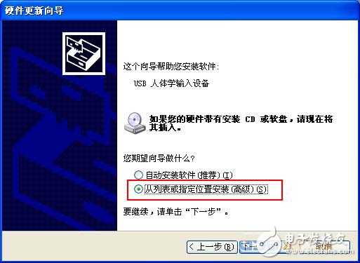 我们把STM32 USB HID下位机程序烧写到STM32中之后,插上USB线,电脑会提示新硬件,但XP系统默认安装的是系统自带的USB HID驱动,不是我们刚才生成的inf驱动程序,如下:
