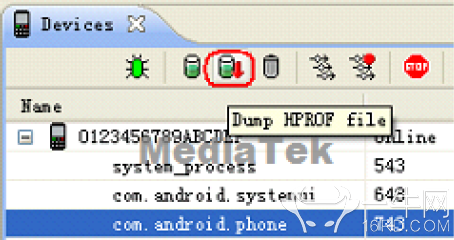 a) 打开ECLIpse,点击device窗口的Dump Hprof file 图标(绿色圆柱体,右边一条向下红色箭头线)