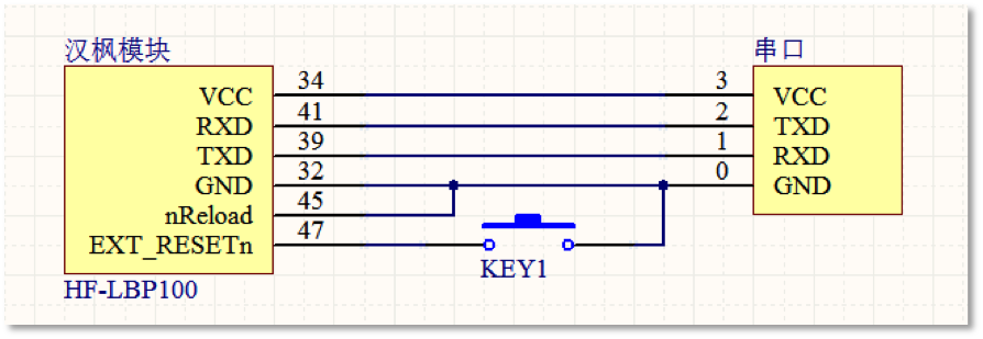 将HF-LPB100模块按照如下原理图进行接线,注意nReload(45号管脚)需要输入低电平,本实验直接接地处理。KEY1实现外部复位功能。