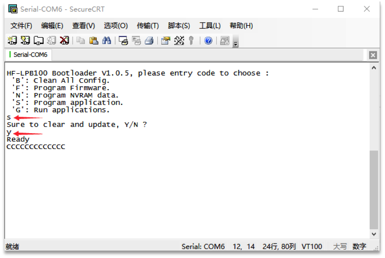 步骤二、输入“S”升级应用程序,再输入“Y”进入接收固件状态。