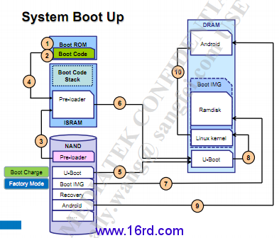 1)上电时,系统从Boot Rom开始启动,Boot Rom加载Preloader到内部RAM(外部RAM还没被初始化)