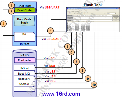 上面是启动流程,preloader除了具有启动功能之外,他还具有下载功能。首先还是需要明确的是mtk芯片都的有个bootrom,如果没有这个rom那么,那么程序是无法被下载到nandflash中的,然后此时的flash上是为空的,没有任何数据的。系统在上电之后它会检测是启动模式还是下载模式,如果是下载模式,它会初始化一个usb的串口,将preloader加载到内部的SRAM中,跳转到preloader中去执行,初始化好flash和外部RAM之后,依次将preloader、lk、kernel、android下载到nandflash中去。下载过程如图所示:
