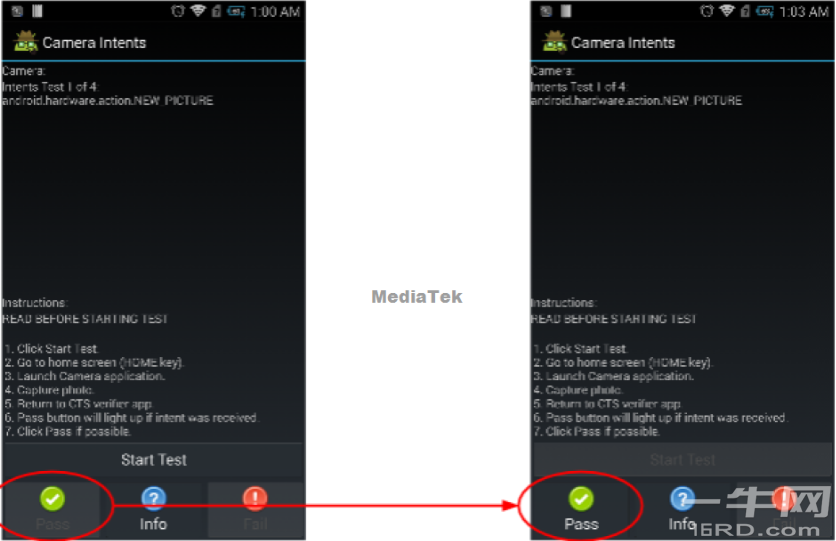 Start Test -> CLIck Home key -> Launch Camera application -> Capture photo -> Return to CTS verifier app -> 如果有收到intent,Pass的button 會亮,就可以點選Pass