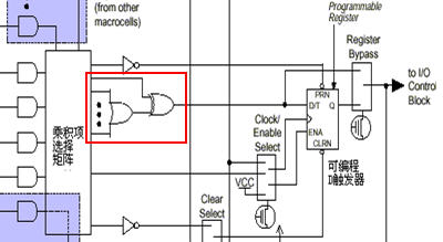 小弟最近在分析(基于乘积项原理)PLD的内部基本逻辑单元结构时,看到它内部还有一到两个门电路(见下图红色圈中),觉得很是奇怪。基于乘积项原理,已经可以将4个输入信号的所用逻辑运算结果表示出来了,为何还在内部保留门电路呢?莫非是为了实现某些快速算法而预留的?