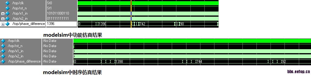 在quartus中写了个module,然后再modelsim中仿真,结果发现功能仿真和时序仿真的结果不一致,如图