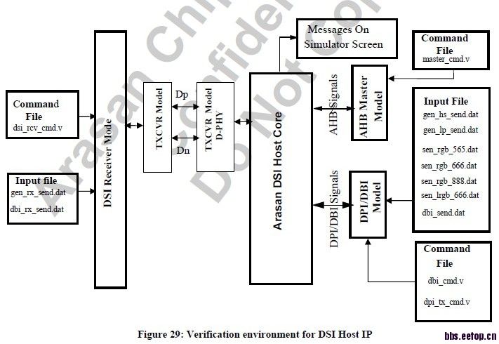 DBI model sends commands and data packets as dictated by dbi_cmd.v .The data to be sent by the DBI model is placed in dbi_send.dat, gen_bs_send,dat, gen_lp_send.dat. for DBI, generic high speed and low power data transfers respectively.