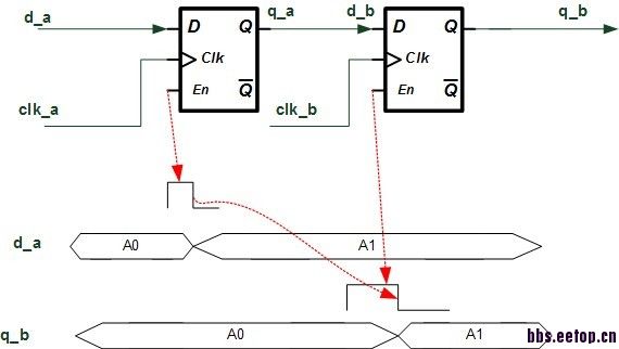 先说说你的最终目的是什么,如果只是把clk_a时钟域的d_q传送到clk_b时钟域的q_b,那直接DFF打两拍就可以了。