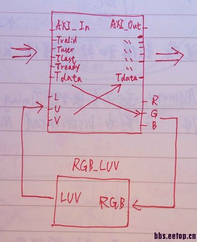 我在做一个RGB到LUV颜色空间转换的IP核,是用的AXI-STREAM的接口,输入为RGB的图像数据(视频),示意图如下: