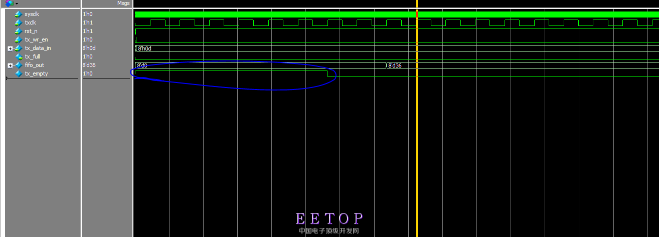 其中,sysclk是写时钟,txclk是读时钟,tx_wr_en是写使能,tx_data_in是写入的数据,tx_empty是fifo空信号,为什么数据已经写进入了,要等六七个读时钟后,空信号才会拉低呢?而数据明明早就写入fifo了。谢谢了!