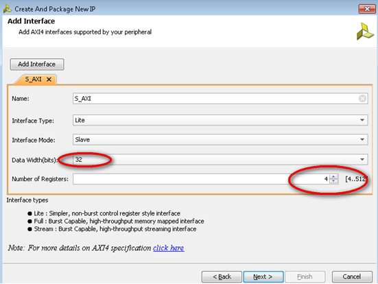 6)更改AXI总线名字,添加4个32位的slv_reg寄存器,其实都是默认的即可