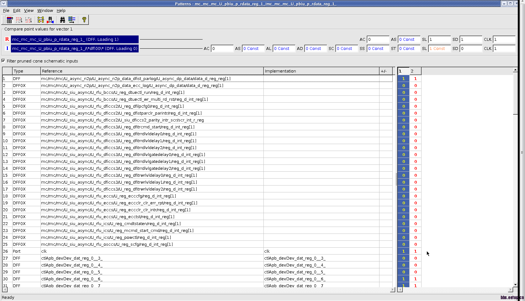 求助formality高手。我现在做了一个RTL和netlist(没加JTAG和DFT)的formal,最后报48个fail point,其中16个是是PWR之类管脚,我觉得可以忽略。还有32个是一个data bus 的registers,死活过不了。我把一些log和其中一个point的fail patten发上来了。请大家帮忙看看是什么原因。谢谢了!
