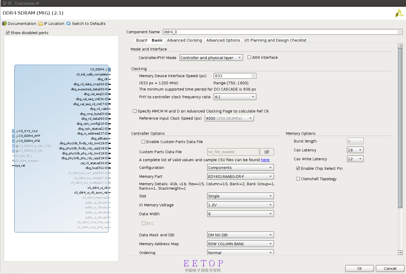 谢谢您的回答, 在设置MIG IP的时候,我对 PHY to controller clock frequency ratio 这个参数不明白, 我在想最后的结果是否与这个有关系?或者说,我想知道的是这个参数什么作用?因为我看到它后面的下拉菜单里面就这个 4:1选项,没有其他的. 另外,我在本站看到一个介绍ddr3 MIG IP设置的帖子地址是http://bbs.eetop.cn/viewthread.php?tid=577122,在附件第34页中看到如下图所示,没有理解和这里对应部分的那句话——“你待会儿操作。因为你这里选了4:1” 。ddr3这里的配置和ddr4的配置两个是一样的吗?