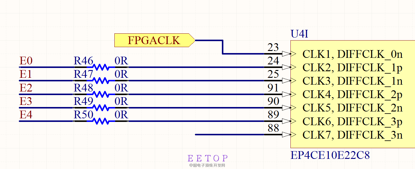 现有一个fpga,其外部时钟输入时钟由两个,一个是CLKREF、一个是CLKIN,他们分别都是接在_n的专用时钟管脚上。如图