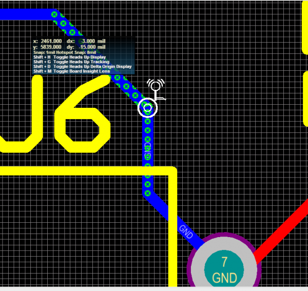 小弟第一次画板子,遇到各种问题。我将自动布线的某一段走线删掉了,然后想自己手动布线,但是连接后出现这种问题,如图1。有个白色的天线似的标志,这个代表什么?
