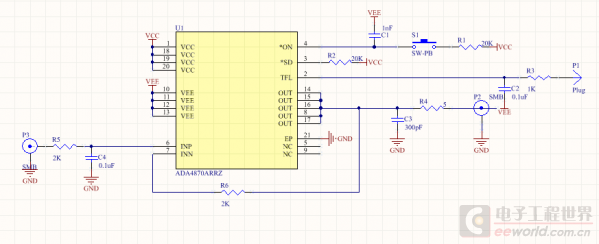 用ADA4870运放驱动10欧负载,接成跟随器的形式,当供电电压为正负17V时,输入正弦信号峰值到7V时输出就出现了削顶失真还有芯片发热的厉害,输出电流有效值还不到0.5A,而数据手册上说的是该芯片输出电流有效值最大能到1A,我的电路原理图如图所示,跪求各位大神给点意见,后期想用它来做换能器负载的驱动。。。