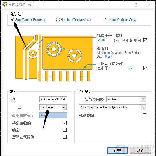 1. 最简单的方法是: Keepout层放一个圈圈,, 然后直接铺铜, 并选中删除孤铜