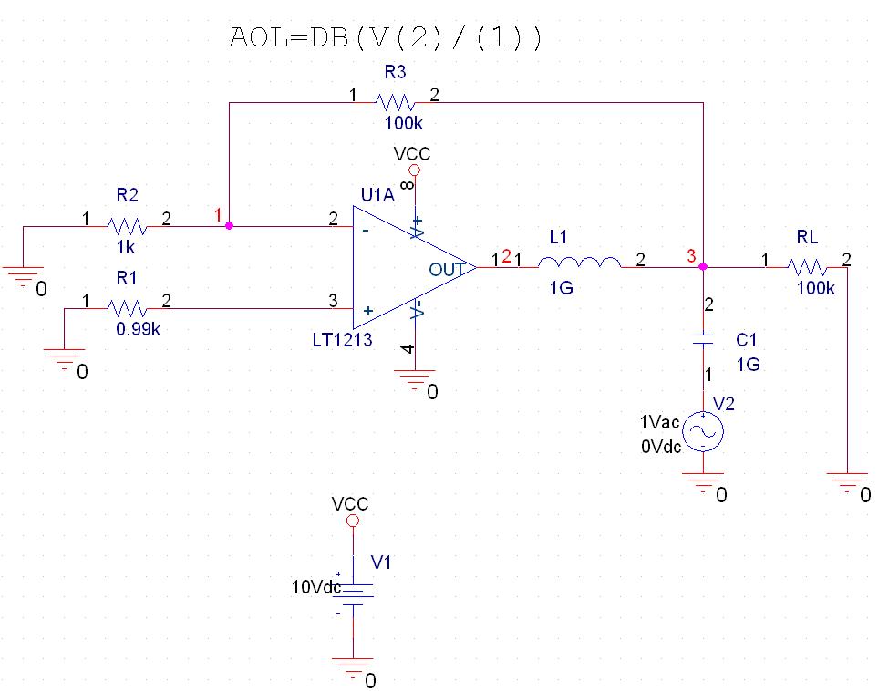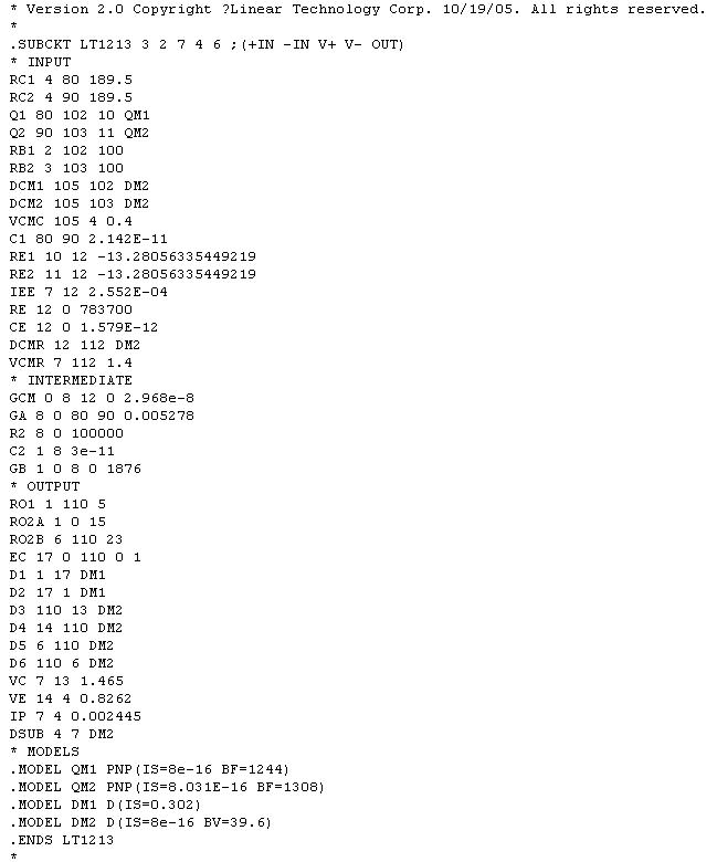 最近从LT的官方网站上下载了一个运放(LT1213)的模型 “LT1213.LIB”。在做测试时发现它的开环增益太小只有23DB,而datasheet的数据是120DB,不知道是测试方法不对,还是模型有问题。