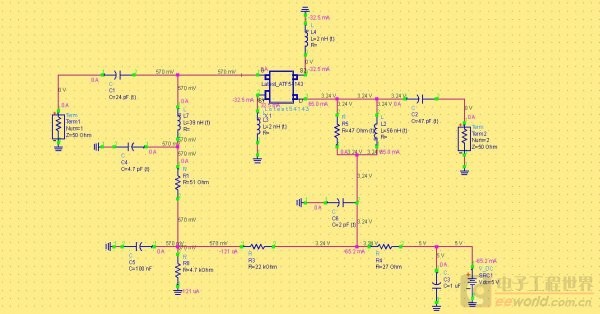 稍稍的分析下,从左看是输入端,电容和电感是进行输入匹配的,右端是输出,也是要进行匹配的,这个匹配电路要根据实际当中不同频率而不同,剩下的就是电阻和电源上面的电容,电阻是提供偏置的,电容是退偶和滤波器作用。还有就是源极上面我挂了两个小电感,这个电感是起到稳定性作用,尤其在高频的时候很重要,这点要在实际中调试,电感很小,大多是在PCB上面直接走微带线。